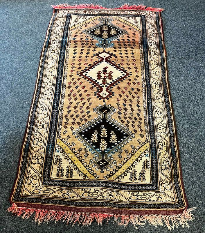 Middle eastern rug with triple central lozenge deign and frilled ends