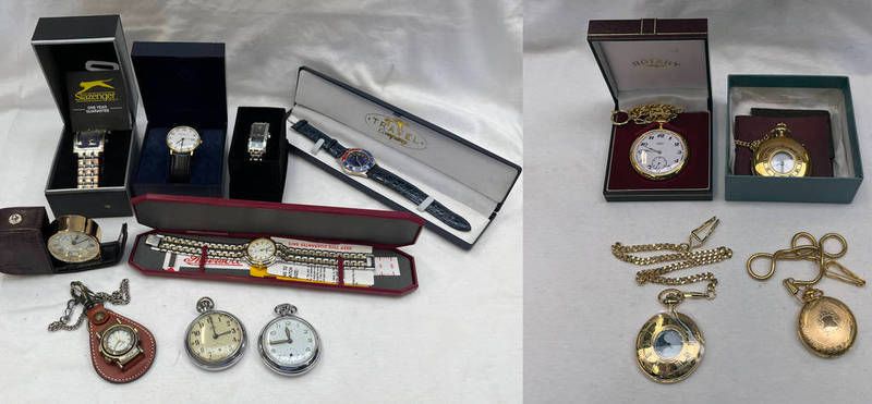 Rotary gilt cased pocket watch with half hunter cover & second dial, gold plated half hunter pocket watch with second dial & date on chain, limit g s hunter pocket watch with sweep second hand & chain & rotary open faced gilt pocket watch on chain and ingersoll wristwatch on bracelet philip mercier wristwatch, watch, guy de vinial wristwatch, via lucia 181 wristwatch, roget lascelles travel alarm clock, 2 chrome art deco style pocket watches by smith & watch on leather hanger with compass swivel fitting