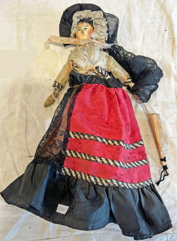 Late 19th or early 20th century carved wooden doll with painted head, arms & feet with hand stitched clothing, 40cm long