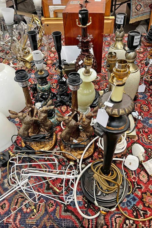Table lamps to include a pair of fighting rabbit examples, onyx hardstone table lamp, pair of porcelain & urn table lamps, etc