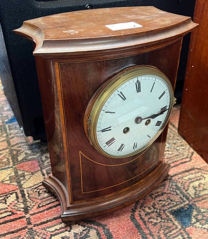 Inlaid mahogany chiming mantle clock with silvered dial & gilt metal works with crossed arrows...