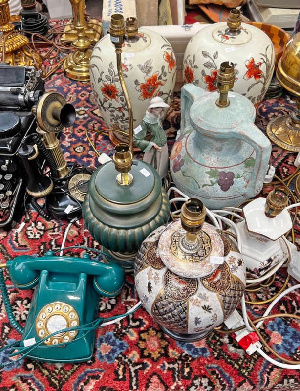 Table lamps to include a pair of floral decorated lamps, figural table lamp, 2 telephones, etc