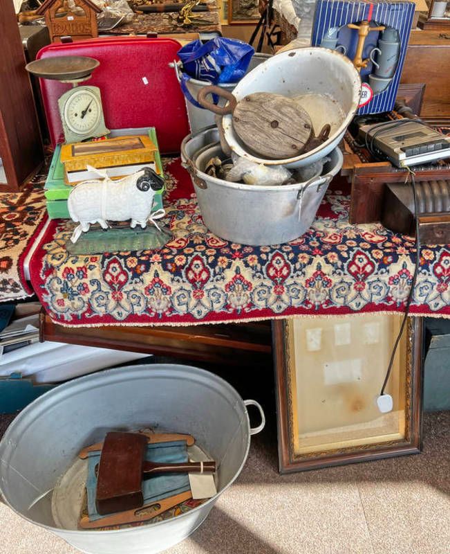 Wall clock (af), display case, tin bath, fire bucket, cast iron sheep door stops, pulley, insects in plastic etc