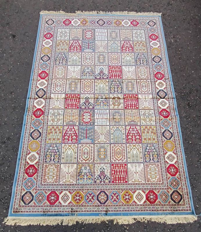Duck blue ground full pile cashmere rug with multicoloured persian panel design 233 x 154cm