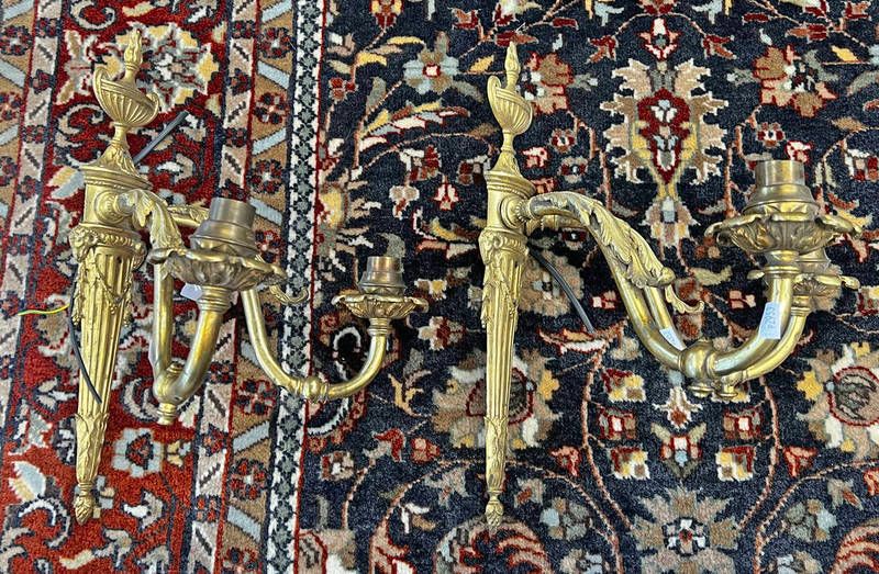 Pair of late 19th or early 20th century gilt metal wall light fittings, 40cm long