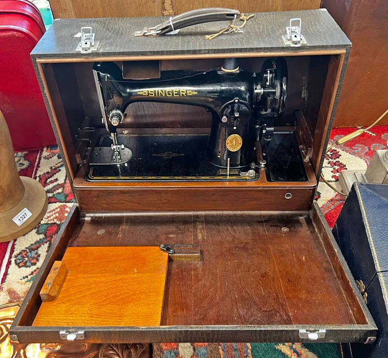 Acme mangle in its original card box and a singer sewing machine, serial number 10293588...