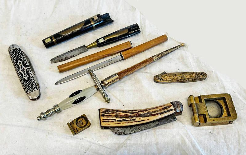 2 pocket knives, paper knives a clements newling & co. london folding pocket loupe magnifying glass etc