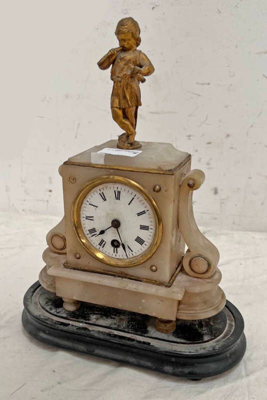 19th century hard stone mantle clock with gilt metal mounts and white enamel dial on wooden base