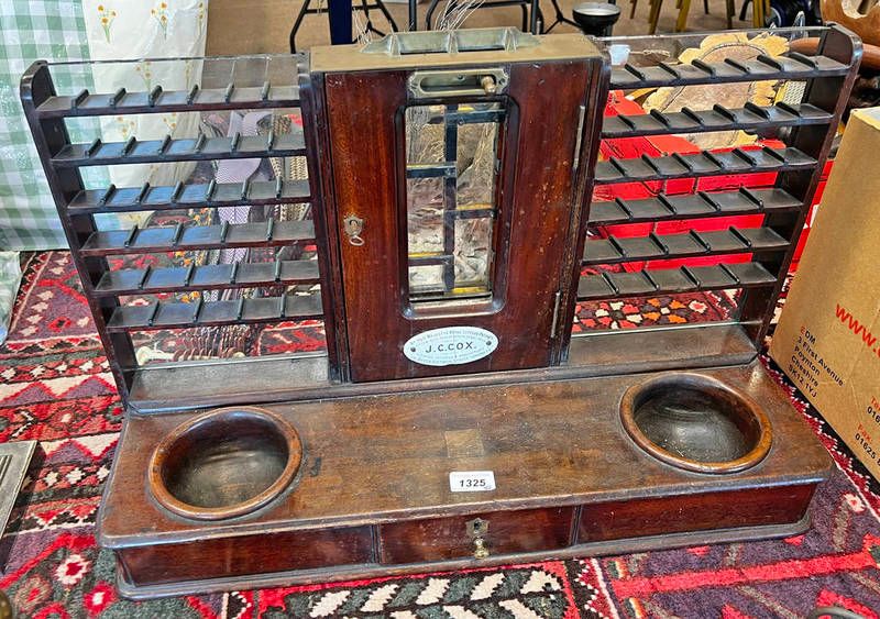 Late victorian double sided mahogany cash till by j c cox, london, 65cm across