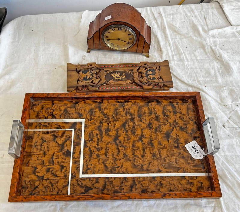 Walnut cased rattray & co mantle clock, book slide and a serving tray 47cm across -3-