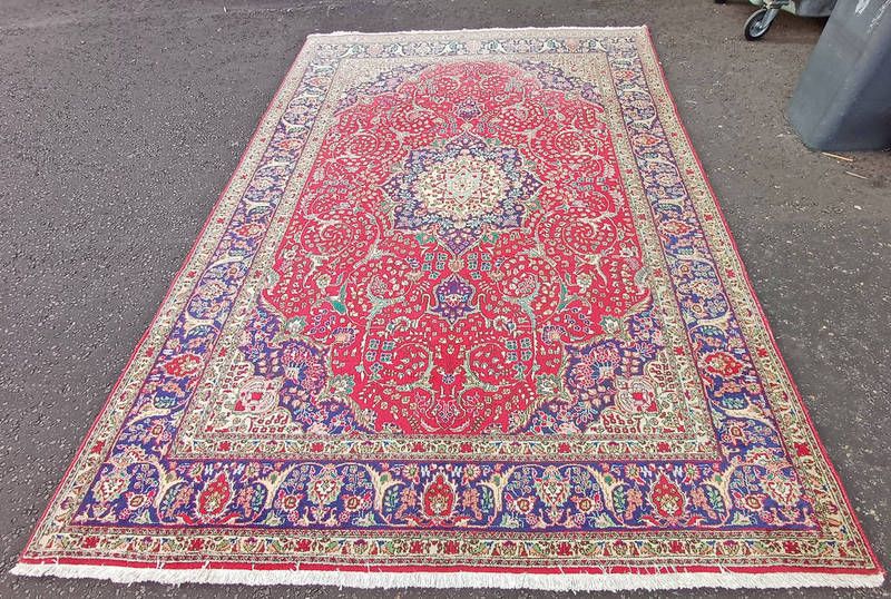 Fine hand woven rich red ground persian tabriz carpet with traditional floral medallion design 357cm x 249cm