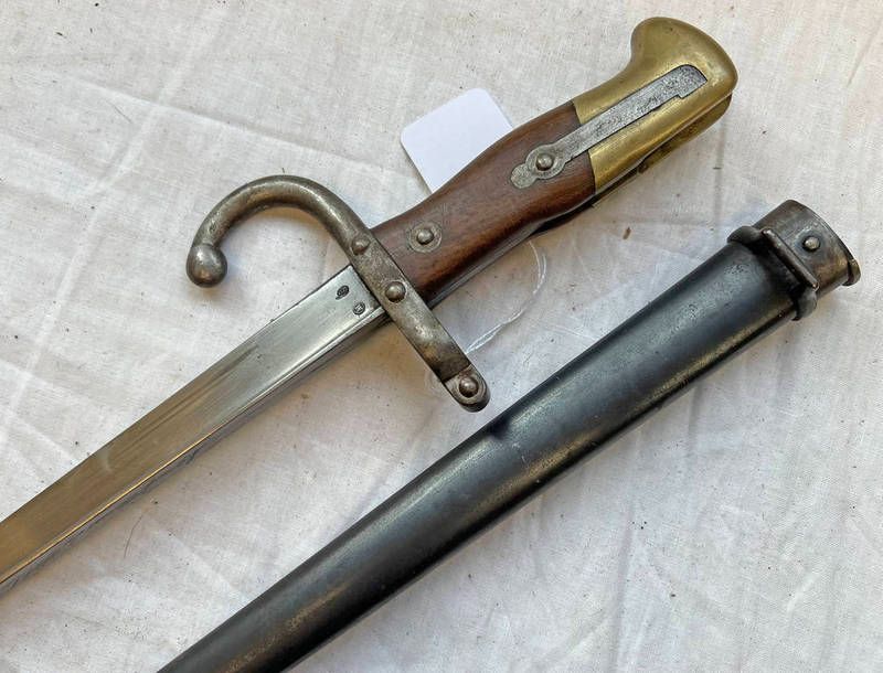 French m1874 gras sword bayonet with 52cm long blade marked mre darmes de st etienne mai 1879, hilt marked 39331 scabbard marked 28625