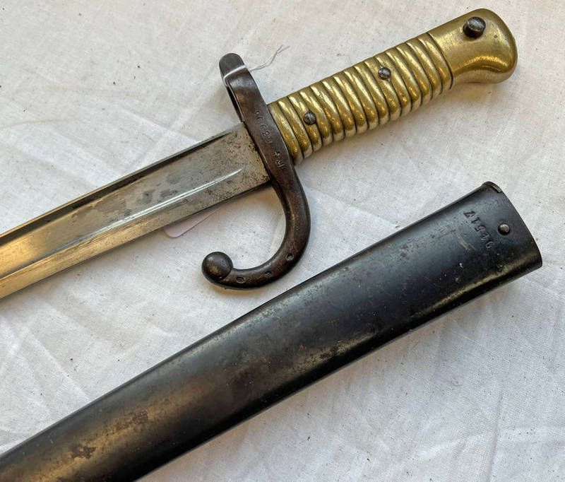 French m1866 chassepot yataghan sword bayonet with 57cm long blade marked st etienne juine 1871, cross guard marked fb 63993 and scabbard marked 94517