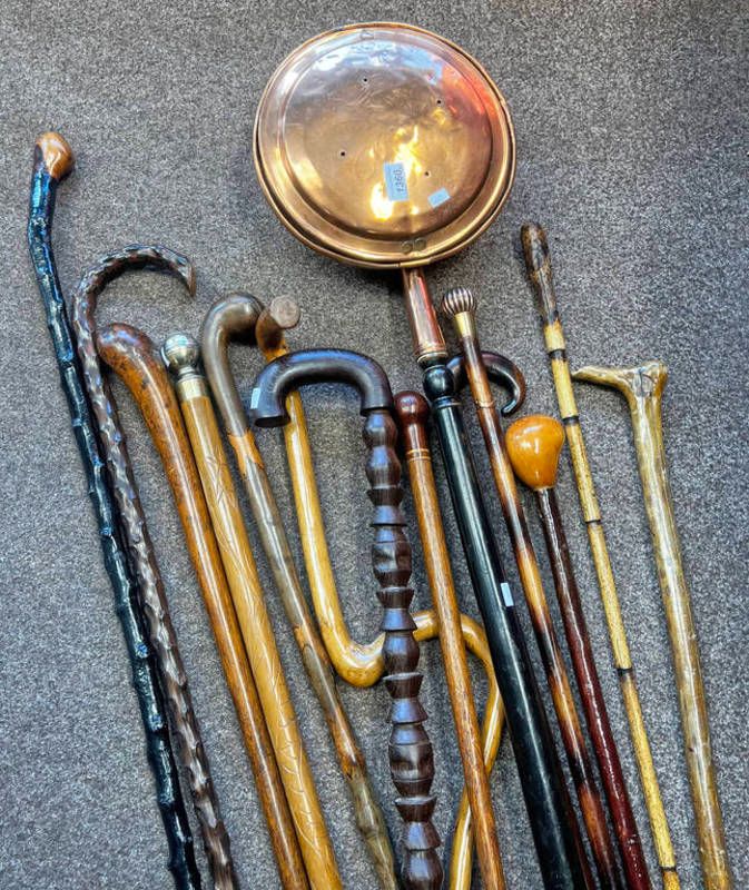 Selection of walking sticks to include root wood examples, copper bodied bed warming pan etc