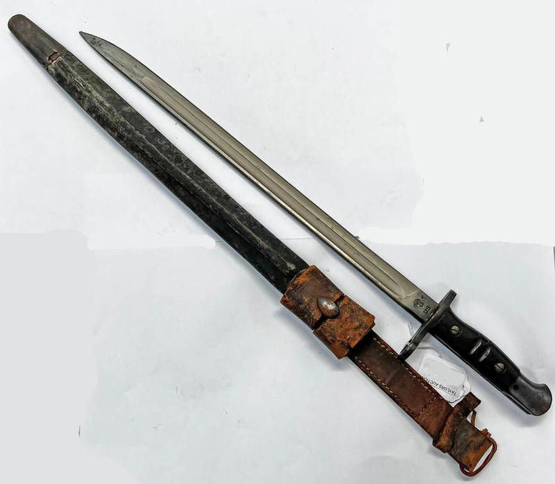 Ww1 us 1913 bayonet with 43cm long blade dated 4/17/1913, with its metal & leather scabbard with leather frog