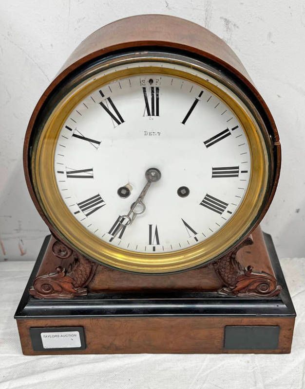 Mahogany cased mantle clock with white enamel face marked with dent makers name and french works, 32cm tall