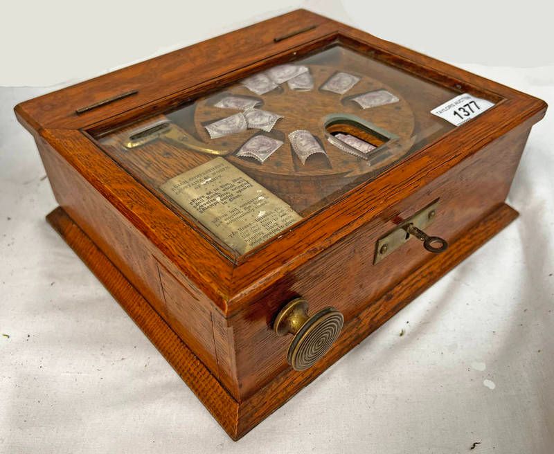 Late 19th century oak coin operated stamp dispenser, rectangular form, glazed panel with printed instructions and key, 24cm across