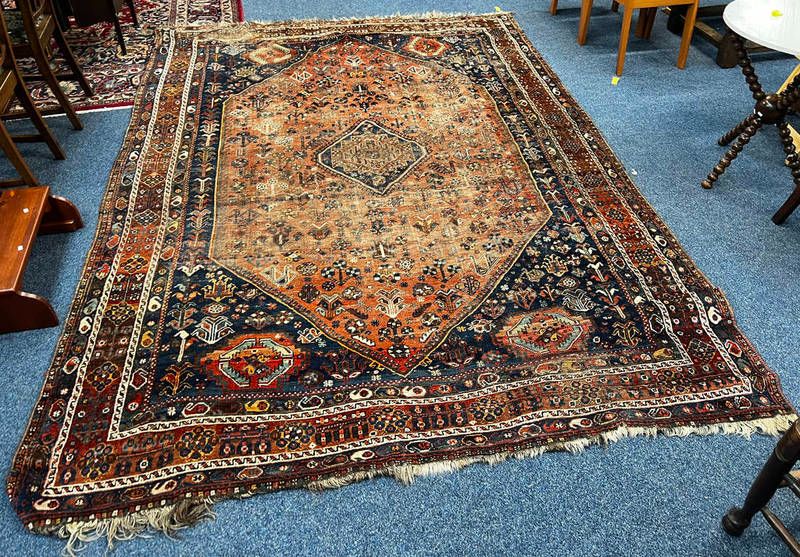 Blue and red middle eastern carpet with central lozenge and border design, 330 x 225cm