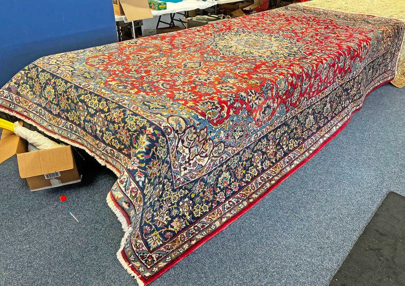 Large red and blue middle eastern carpet with all over design 400 x 300cm