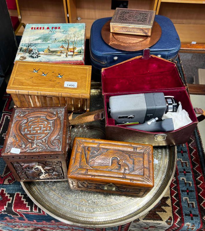 Middle eastern brass tray, oriental carved wooden boxes, elkes & fox biscuit tin, elmo 8-s camera etc