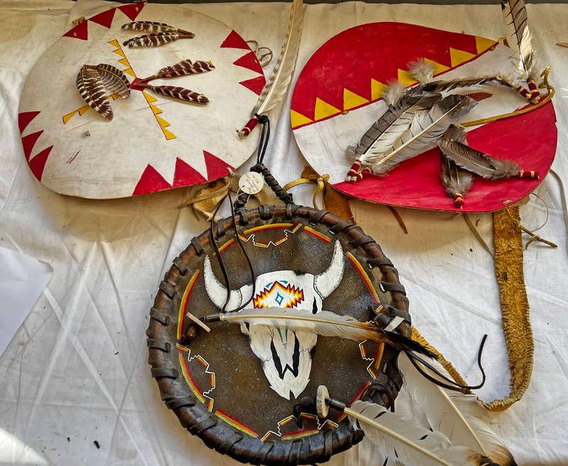2 native american hide hand shields and a raw hide buffalo shield 33cm across -3-