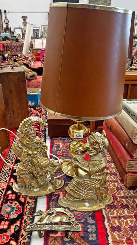Brass bulbous table lamp, brass punch and judy door stops and a brass jockey on horse ornament -4-