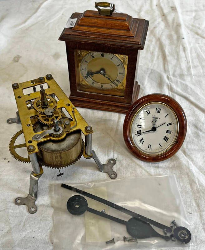 Miniature mantle clock with mercer works 13cm tall, swiza travel clock and a set of clock works -3-