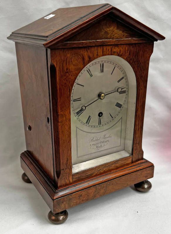 Late 19th or early 20th century walnut cased library clock with silvered face marked bethel jacobs 7 whitefriargate hull, gilt brass works and a meyrick neilson tetbury gloucestershire label to interior, 25cm tall