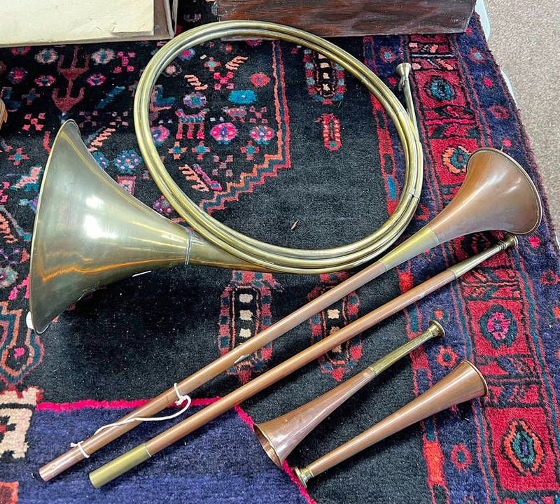 Copper & brass posting horn, 2 small copper & brass horns, & a brass french horn -4-