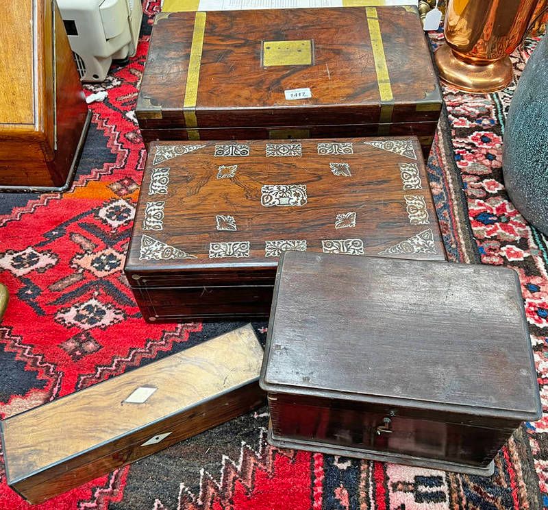 19th century brass bound rosewood writing box, mother of pearl inlaid writing box, and two others -4-