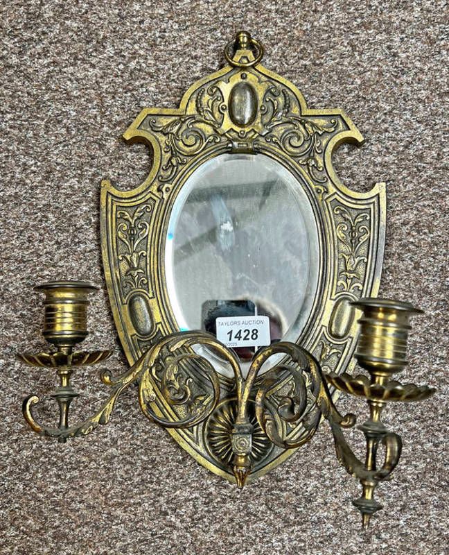 Late 19th or early 20th century cast brass candlestick, wall mirror marked c & m to rear 28cm long
