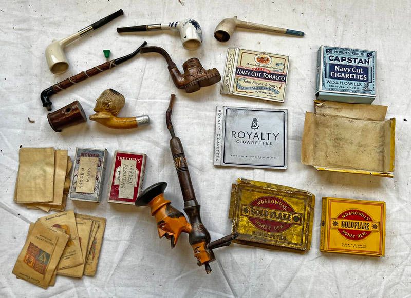 Tobacco pipes, cigarette boxes, and cigarette cards to include wills gold flake box, navy cut tobacco, robbie burns pipe, clay pipe, kensitas cigarette flag cards, etc