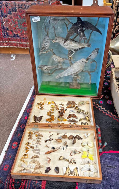Glazed bird taxidermy display consisting of 8 specimens along with a cased entomology display with crockett london label to interior