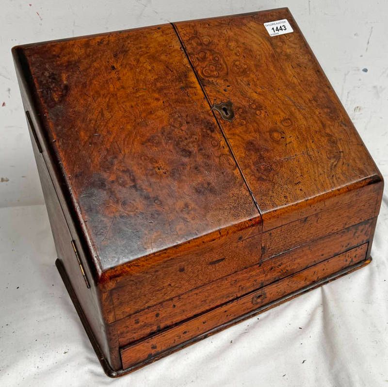 Late 19th century walnut sloped writing box/stationary cabinet with fitted sectional interior, 30cm tall