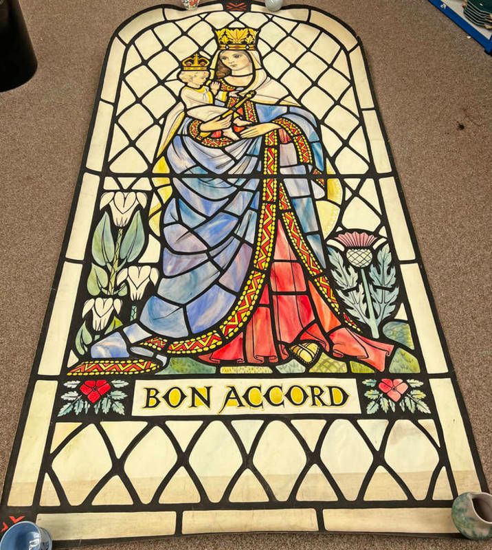 Large unframed painting of a stained glass window decorated with the virgin mary, thistles, bon accord, etc, 290cm x 137cm