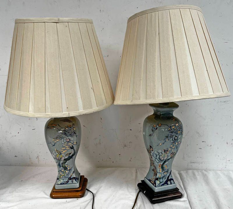 Pair of porcelain bodied oriental lamps with floral decoration & shades 68cm tall