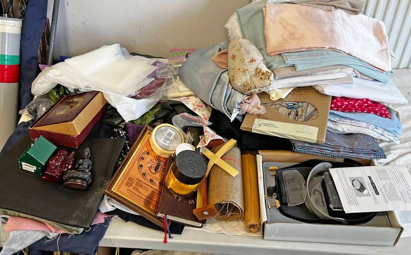 Selection of clothing, fabrics, jewellers magnifying glasses with light in box etc