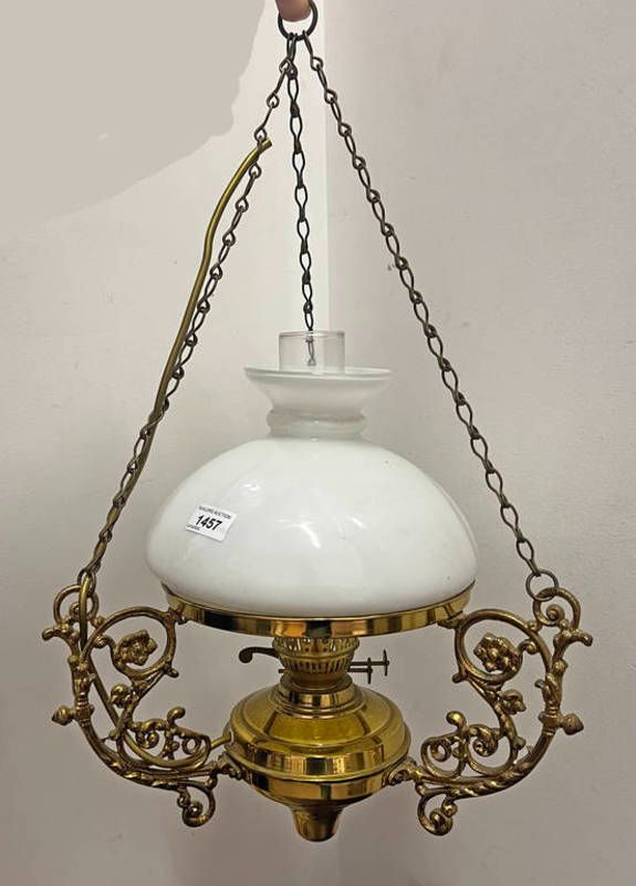 Early 20th century gilt metal roof hung paraffin lamp with white glass shade