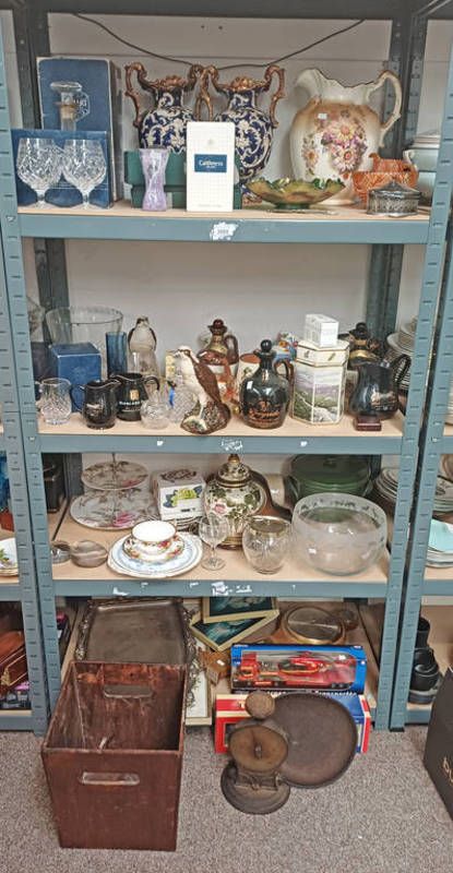 Various corgi lorries, aneroid barometer, silver plated tray, large etched glass bowl, 2 whyte & mackay royal doulton osprey whisky flasks, various other whisky related jugs, etc, various large vases, carnival glass, etc on 4 shelves