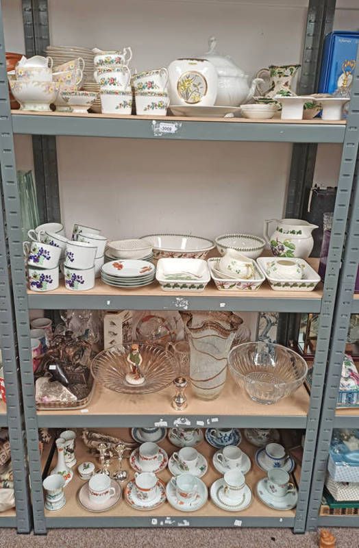 portmeirion ware dinnerware, belleek porcelain ware, royal worcester evesham vale dinnerware, coalport porcelain teaware, art glass vase, bombay signed cut glass bowl, etc over 4 shelves