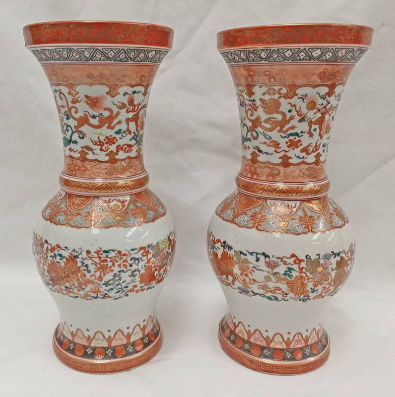 Pair japanese kutani vases with floral & dragon decoration, 6 character mark to base - 30 cm tall