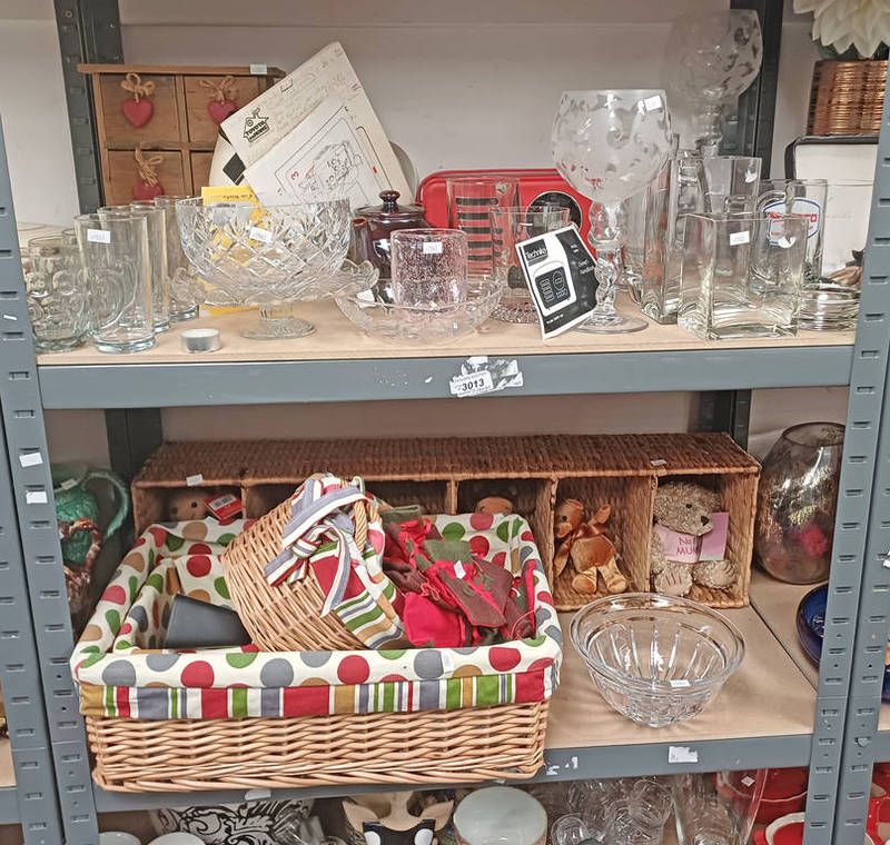 Various cut glass ware, technica radio, wicker baskets, teddy bears, etc on 2 shelves