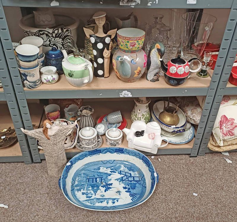 Oriental bowl, cut glassware, art pottery figures, teaware, masons bowl, ashet, etc on 2 shelves