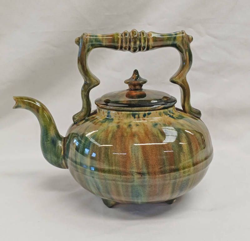 Victorian seaton pottery green & blue glazed teapot/kettle on 4 supports - 21 cm tall