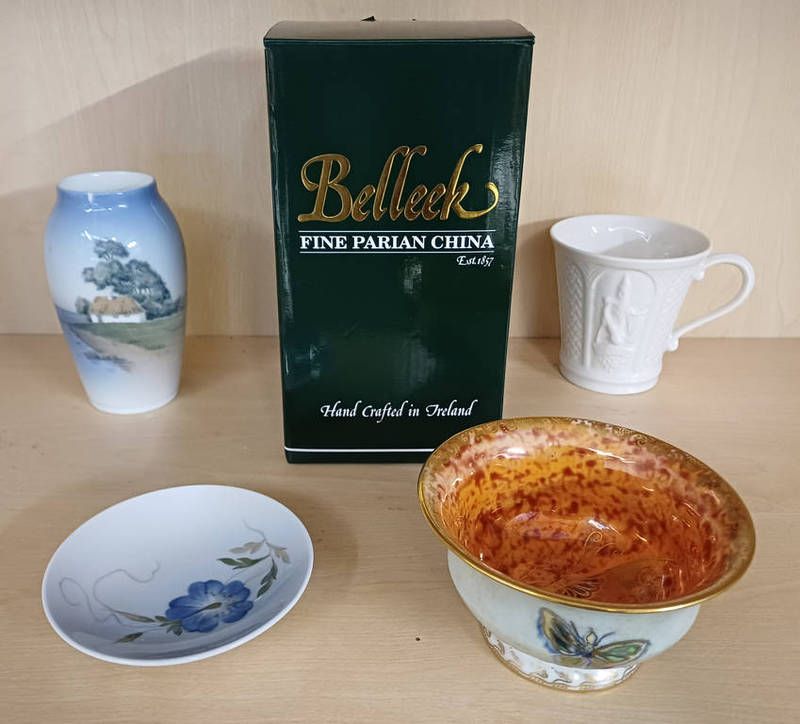 Wedgwood lustre ware bowl with butterfly decoration - 11.5 cm diameter together with belleek mug, royal copenhagen vase (af) and pin dish