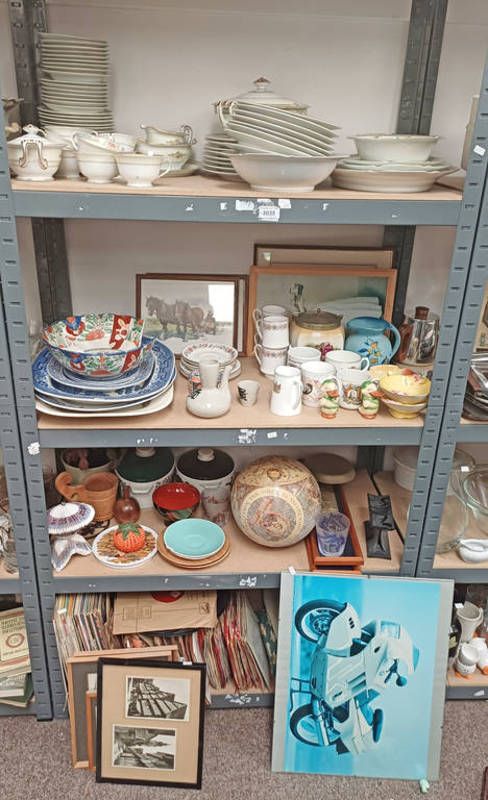Noritake porcelain dinner set, various blue & white ashets, large selection of records, various pictures over 4 shelves