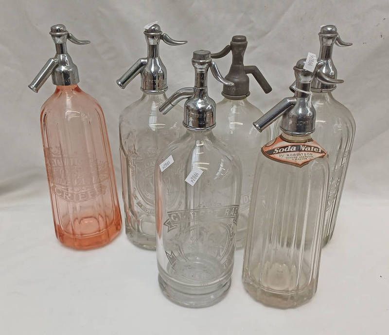 6 vintage soda syphons including pink glass harley & watts pure table water crieff, melville & co. tayport dundee, william petrie edinburgh, gilbert rae dunfermline, rankin & borland chemists, kilmarnock & james dunbars prize medal aerated water albion road edinburgh