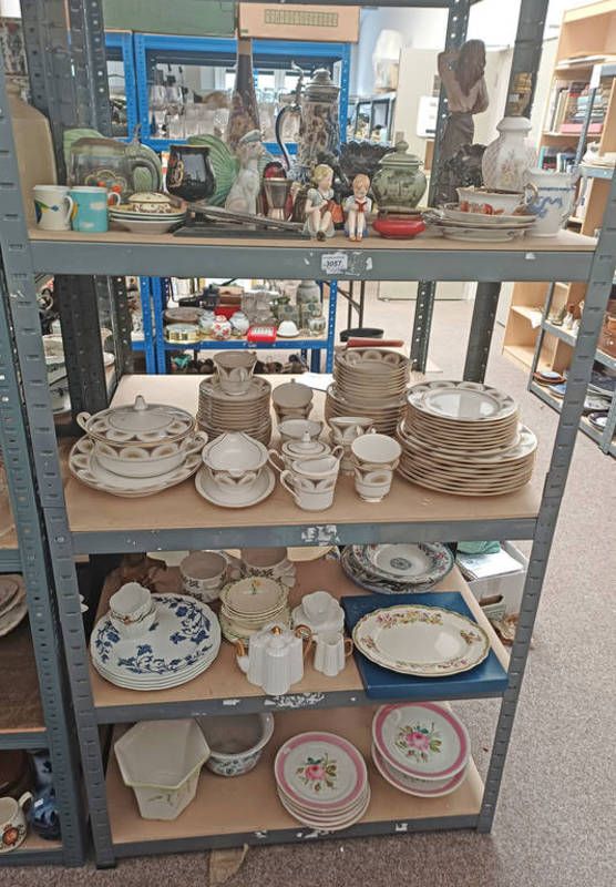 2 goebel porcelain figures of boy & girl, various other porcelain, noritake porcelain 8 place dinner set with tureen & ashets, etc on 4 shelves