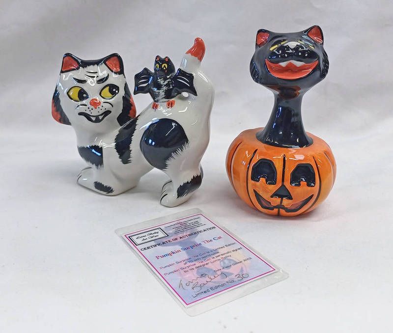 Two lorna bailey halloween themed cat figures including pumpkin surprise the cat and other. tallest - 13 cm