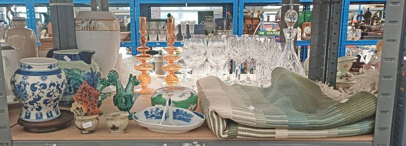 Cut glass claret jug with silver plated mounts, oriental hardstone pieces, oriental blue & white vase, various other blue & white ware, art glassware, etc on 1 shelf